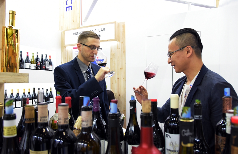 2021年6月1日,2021中国(北京)国际葡萄酒展览会上,一名来自法国的参展商(左)邀请参观者品鉴法国出产的葡萄酒。新华社记者 潘旭 摄