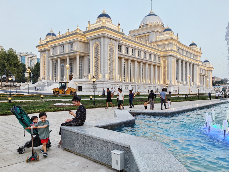 在总统府正门前平台驻足,拉赫蒙总统指向不远处中国援建的议会大楼和政府大楼,告诉习近平主席:“议会大楼前广场已成为市民们休闲避暑的好去处,是杜尚别的新打卡地。”