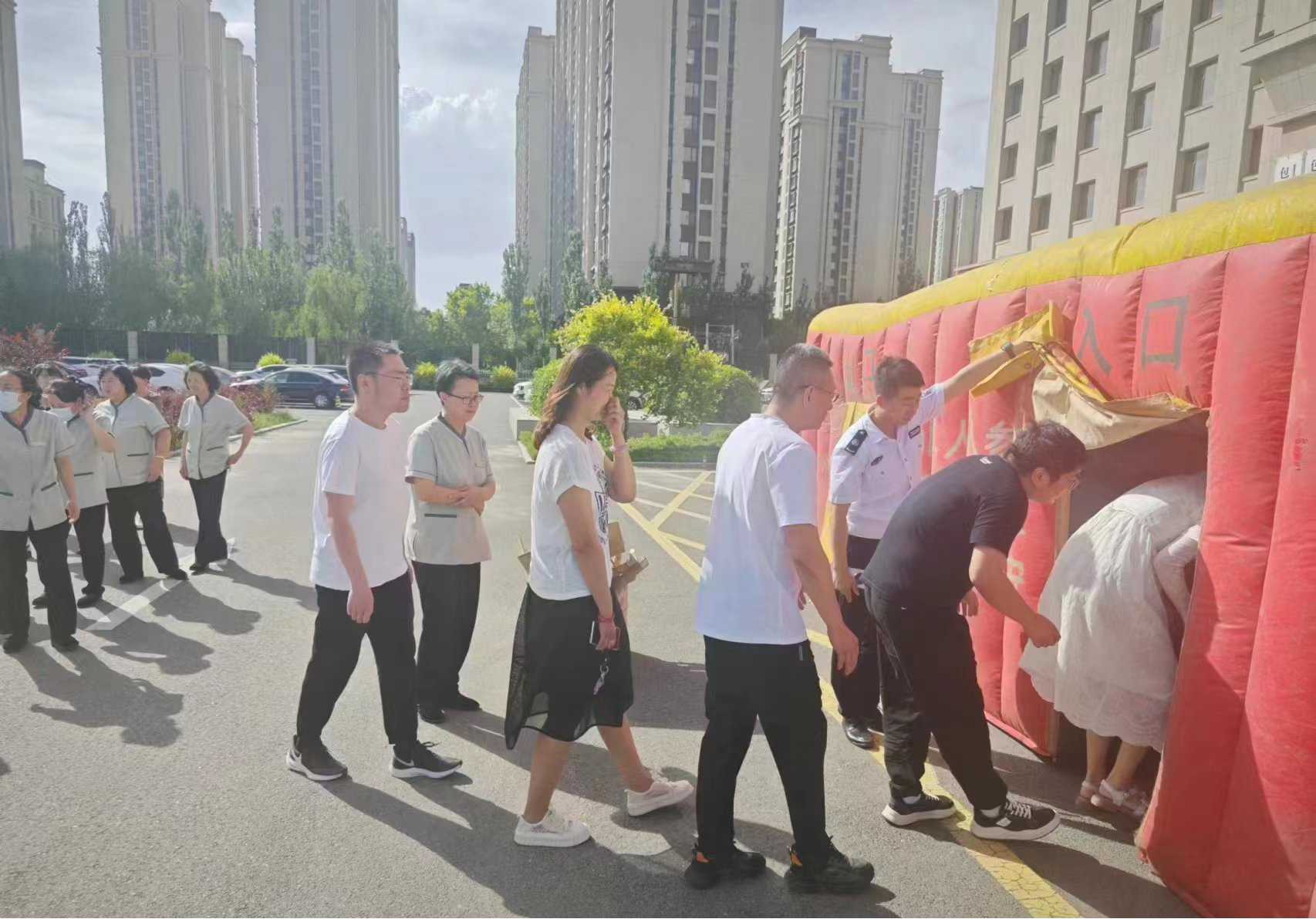 审计干部和物业公司职工演练火灾扑救方法